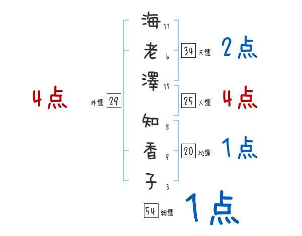 外運![]() | 海老澤知香子さんの外運は29画の4つ星!完全主義で才能がある。厳格な心の持ち主。 生活面を象徴する運勢です。外部から受ける影響力を表し、結婚運、家庭運や職場、環境への順応性を表します。 |