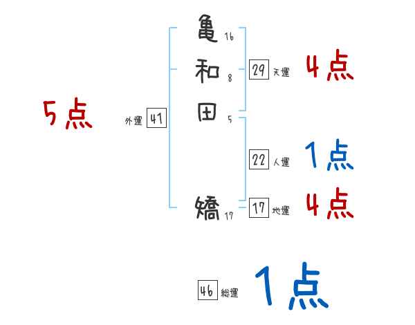 総運![]() | 亀和田矯さんの総運は46画の1つ星!迷走することが多く苦労するかも。目先のことにとらわれないように。 あなたの人生を表す1番重要な運勢です。生涯を通じて影響する総合運となり、主に50歳以降の晩年期に影響を及ぼします。 |