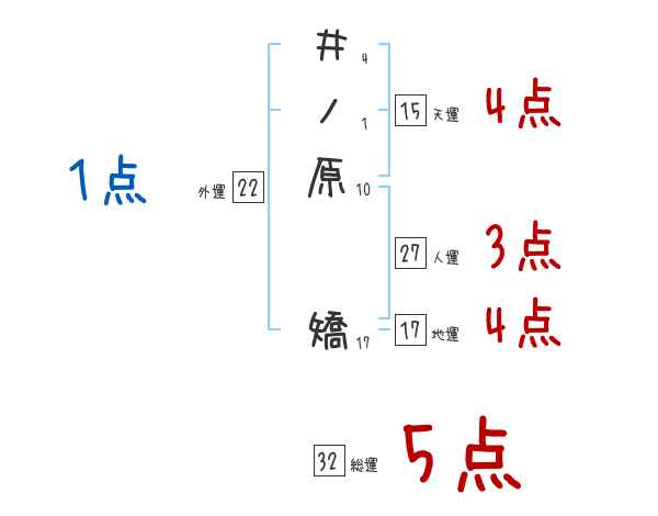 総運![]() | 井ノ原矯さんの総運は32画の5つ星!柔軟性があり成功する。チャンスが多く金運が良い。 あなたの人生を表す1番重要な運勢です。生涯を通じて影響する総合運となり、主に50歳以降の晩年期に影響を及ぼします。 |