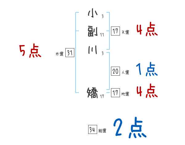 総運![]() | 小副川矯さんの総運は34画の2つ星!独創性に優れるが、自尊心が強く災難に注意しましょう。 あなたの人生を表す1番重要な運勢です。生涯を通じて影響する総合運となり、主に50歳以降の晩年期に影響を及ぼします。 |