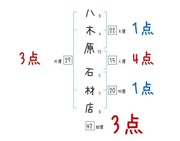 天運![]() | 八木原石材店さんの天運は22画の1つ星!努力することが苦手ないっぽう手先が器用。芸術性にも優れる。 家系が持つ宿命的な運勢を表します。祖先から受け継いだ苗字ですので自分の力が及びません。家柄を象徴します。 |