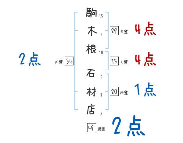 天運![]() | 駒木根石材店さんの天運は29画の4つ星!完全主義で才能がある。厳格な心の持ち主。 家系が持つ宿命的な運勢を表します。祖先から受け継いだ苗字ですので自分の力が及びません。家柄を象徴します。 |