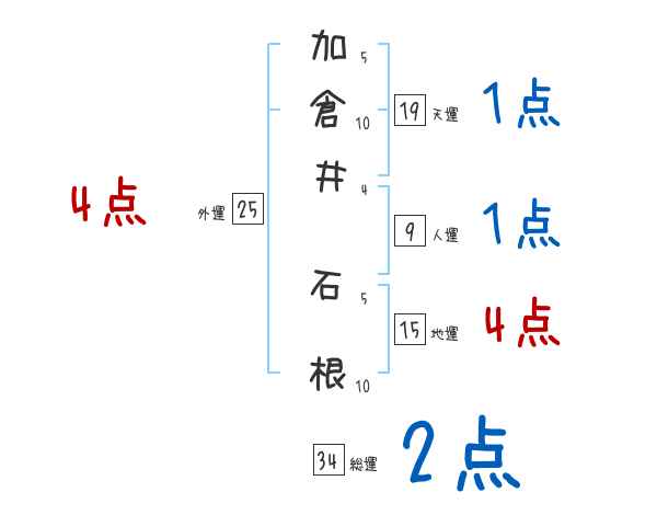 天運![]() | 加倉井石根さんの天運は19画の1つ星!優れた才能を持ちますが、協調性が足りないことも。周りの人と協力する事を意識しましょう。 家系が持つ宿命的な運勢を表します。祖先から受け継いだ苗字ですので自分の力が及びません。家柄を象徴します。 |