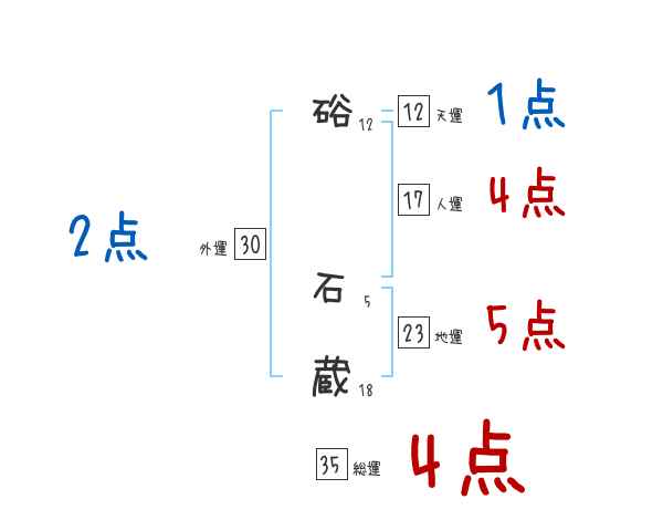 天運![]() | 硲石蔵さんの天運は12画の1つ星!簡単な失敗で諦めてしまいやすいかも。着実に行動すると良いでしょう。 家系が持つ宿命的な運勢を表します。祖先から受け継いだ苗字ですので自分の力が及びません。家柄を象徴します。 |