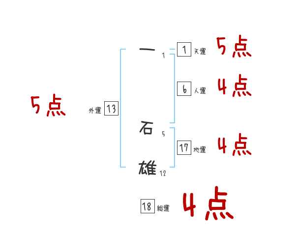 天運![]() | 一石雄さんの天運は1画の5つ星!行動力、指導力があり出世し繁栄する。幸運に恵まれる。 家系が持つ宿命的な運勢を表します。祖先から受け継いだ苗字ですので自分の力が及びません。家柄を象徴します。 |