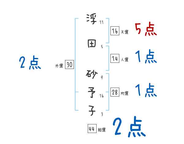 天運![]() | 浮田砂予子さんの天運は16画の5つ星!人望が厚く大きく発展する。逆転成功が見える。 家系が持つ宿命的な運勢を表します。祖先から受け継いだ苗字ですので自分の力が及びません。家柄を象徴します。 |