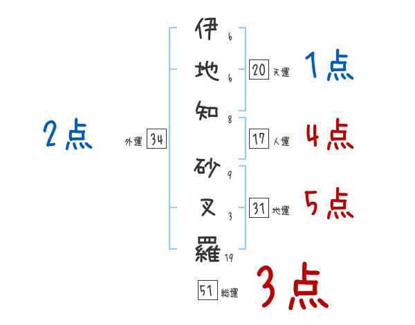 総運![]() | 伊地知砂叉羅さんの総運は51画の3つ星!変化が激しく、危険に注意。堅実な性格。 あなたの人生を表す1番重要な運勢です。生涯を通じて影響する総合運となり、主に50歳以降の晩年期に影響を及ぼします。 |