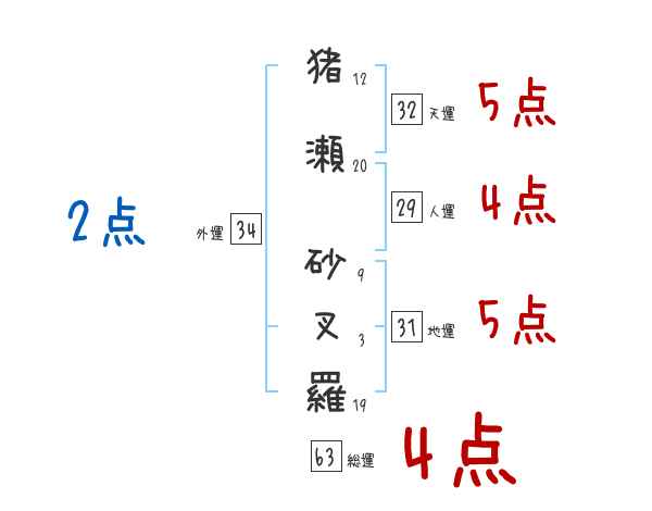 総運![]() | 猪瀬砂叉羅さんの総運は63画の4つ星!家庭運がよく順調な生活。温和な性格。 あなたの人生を表す1番重要な運勢です。生涯を通じて影響する総合運となり、主に50歳以降の晩年期に影響を及ぼします。 |