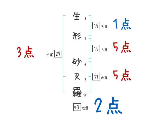 地運![]() | 生形砂叉羅さんの地運は31画の5つ星!社交性があり判断力に優れる。順風満帆な人生で円満な生活。 個性を表す基礎的な運勢です。性格形成や対人関係、行動力など家庭環境に影響されます。主に誕生してから20歳くらいまでの若年期の運勢を表します。 |