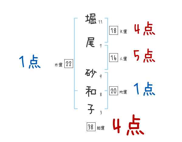人運![]() | 堀尾砂和子さんの人運は16画の5つ星!人望が厚く大きく発展する。逆転成功が見える。 性格や才能などを表す2番目に重要な運勢です。人間関係や協調性、社会的な成功に影響します。主に20歳から50歳ぐらいまでの中年期の運勢を表します。 |
