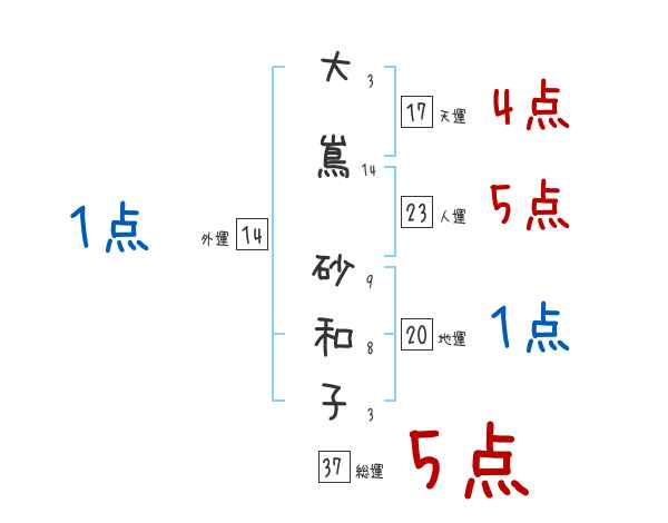 外運![]() | 大嶌砂和子さんの外運は14画の1つ星!人に対して優しいがストレスを溜め込みがち。人間関係のトラブルを避けるよう気をつけましょう。 生活面を象徴する運勢です。外部から受ける影響力を表し、結婚運、家庭運や職場、環境への順応性を表します。 |