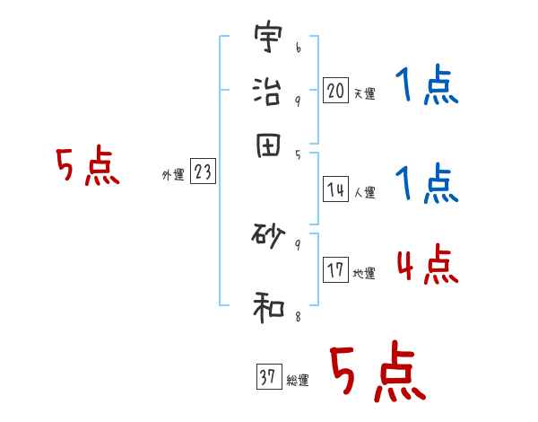 外運![]() | 宇治田砂和さんの外運は23画の5つ星!想像力に優れ活力がある。一代で成功し名誉を手に入れる。 生活面を象徴する運勢です。外部から受ける影響力を表し、結婚運、家庭運や職場、環境への順応性を表します。 |