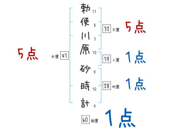 天運![]() | 勅使川原砂時計さんの天運は32画の5つ星!柔軟性があり成功する。チャンスが多く金運が良い。 家系が持つ宿命的な運勢を表します。祖先から受け継いだ苗字ですので自分の力が及びません。家柄を象徴します。 |