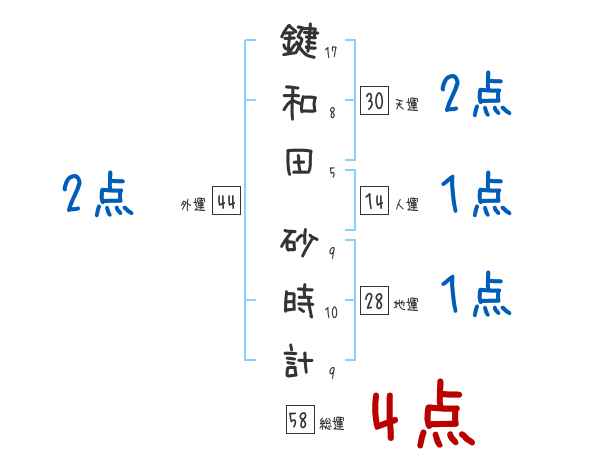 天運![]() | 鍵和田砂時計さんの天運は30画の2つ星!浮き沈みの激しさに注意しましょう。 家系が持つ宿命的な運勢を表します。祖先から受け継いだ苗字ですので自分の力が及びません。家柄を象徴します。 |