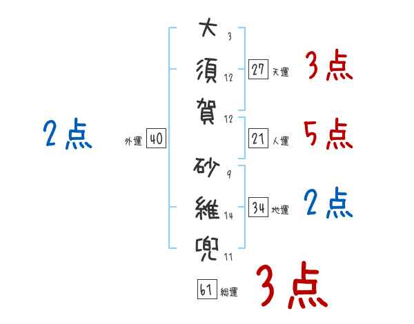 天運![]() | 大須賀砂維兜さんの天運は27画の3つ星!頭脳明晰だが強情で摩擦が多い傾向。孤立に注意。 家系が持つ宿命的な運勢を表します。祖先から受け継いだ苗字ですので自分の力が及びません。家柄を象徴します。 |
