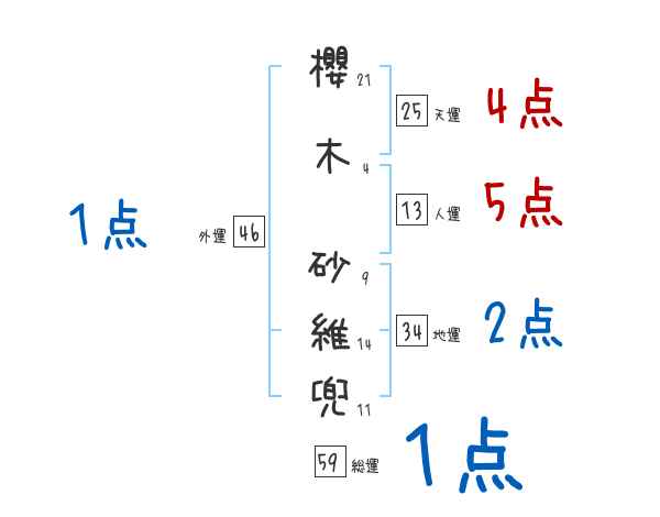 総運![]() | 櫻木砂維兜さんの総運は59画の1つ星!意志の弱さであきらめることが多いかも。粘り強さが必要。 あなたの人生を表す1番重要な運勢です。生涯を通じて影響する総合運となり、主に50歳以降の晩年期に影響を及ぼします。 |