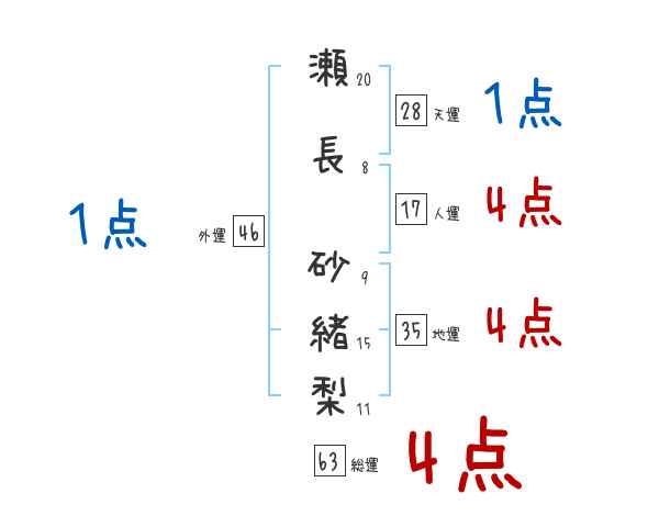 総運![]() | 瀬長砂緒梨さんの総運は63画の4つ星!家庭運がよく順調な生活。温和な性格。 あなたの人生を表す1番重要な運勢です。生涯を通じて影響する総合運となり、主に50歳以降の晩年期に影響を及ぼします。 |