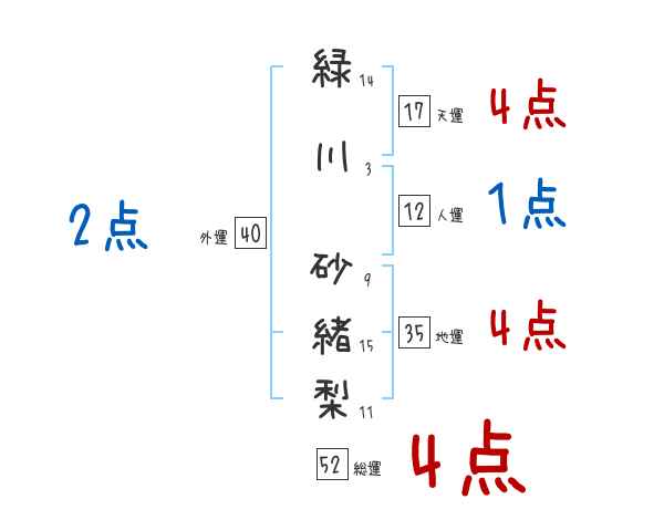 外運![]() | 緑川砂緒梨さんの外運は40画の2つ星!自信過剰で物事に固執するためトラブルに注意。 生活面を象徴する運勢です。外部から受ける影響力を表し、結婚運、家庭運や職場、環境への順応性を表します。 |