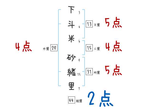 総運![]() | 下斗米砂緒里さんの総運は44画の2つ星!誠実で慎重な性格。物事を考えすぎないように注意しましょう。 あなたの人生を表す1番重要な運勢です。生涯を通じて影響する総合運となり、主に50歳以降の晩年期に影響を及ぼします。 |