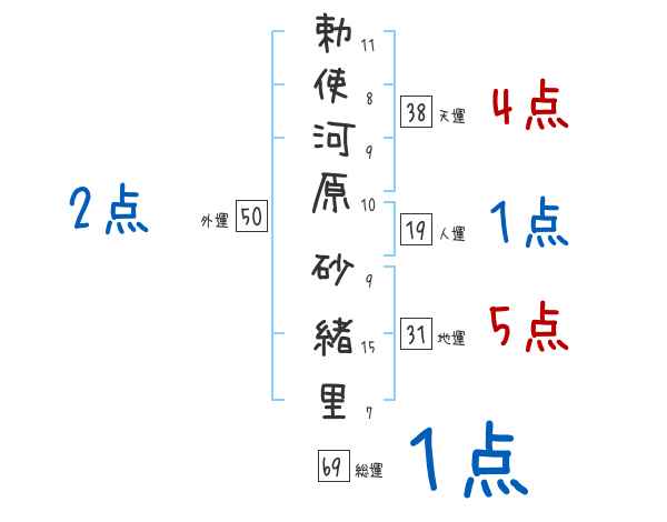 外運![]() | 勅使河原砂緒里さんの外運は50画の2つ星!浮き沈みが激しく不安定。しりすぼみに衰退しやすいので注意しましょう。 生活面を象徴する運勢です。外部から受ける影響力を表し、結婚運、家庭運や職場、環境への順応性を表します。 |
