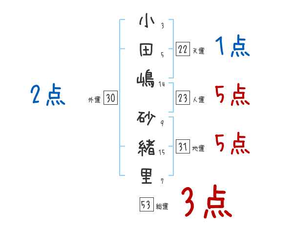総運![]() | 小田嶋砂緒里さんの総運は53画の3つ星!やや見栄っ張りで虚栄心がある。散財に注意。 あなたの人生を表す1番重要な運勢です。生涯を通じて影響する総合運となり、主に50歳以降の晩年期に影響を及ぼします。 |