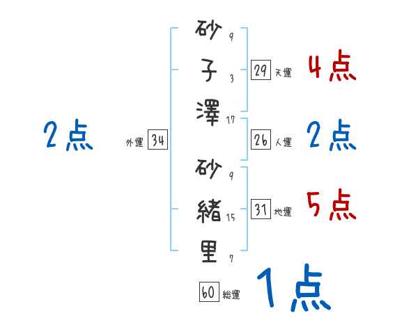 外運![]() | 砂子澤砂緒里さんの外運は34画の2つ星!独創性に優れるが、自尊心が強く災難に注意しましょう。 生活面を象徴する運勢です。外部から受ける影響力を表し、結婚運、家庭運や職場、環境への順応性を表します。 |