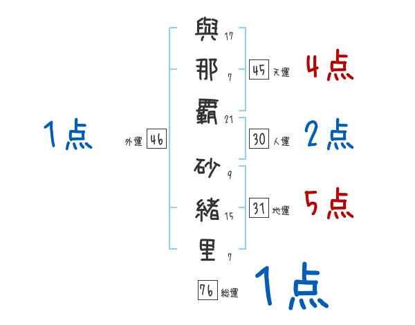 天運![]() | 與那覇砂緒里さんの天運は45画の4つ星!もくもくと物事を進め達成する。地味な努力家。 家系が持つ宿命的な運勢を表します。祖先から受け継いだ苗字ですので自分の力が及びません。家柄を象徴します。 |