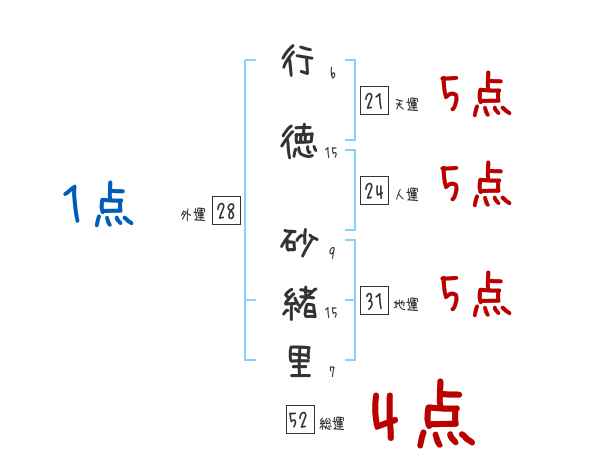 天運![]() | 行徳砂緒里さんの天運は21画の5つ星!統率力がある。独立し成功する。名誉を手に入れる。 家系が持つ宿命的な運勢を表します。祖先から受け継いだ苗字ですので自分の力が及びません。家柄を象徴します。 |