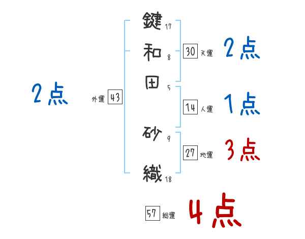 総運![]() | 鍵和田砂織さんの総運は57画の4つ星!向上心があり人望がある。地位を得る。 あなたの人生を表す1番重要な運勢です。生涯を通じて影響する総合運となり、主に50歳以降の晩年期に影響を及ぼします。 |