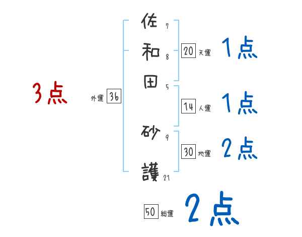 外運![]() | 佐和田砂護さんの外運は36画の3つ星!先見性が豊かです。多少神経質で苦労することも。 生活面を象徴する運勢です。外部から受ける影響力を表し、結婚運、家庭運や職場、環境への順応性を表します。 |