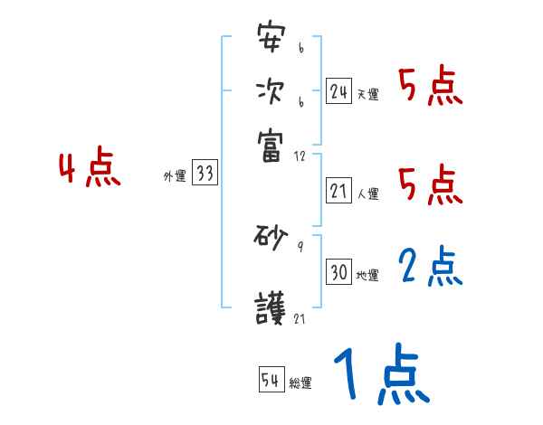 天運![]() | 安次富砂護さんの天運は24画の5つ星!家庭運が良く順調な人生。金運にも恵まれる。 家系が持つ宿命的な運勢を表します。祖先から受け継いだ苗字ですので自分の力が及びません。家柄を象徴します。 |