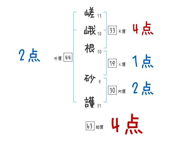 天運![]() | 嵯峨根砂護さんの天運は33画の4つ星!権力志向でプライドが高い。勇気があり運を切り開き成功する。 家系が持つ宿命的な運勢を表します。祖先から受け継いだ苗字ですので自分の力が及びません。家柄を象徴します。 |
