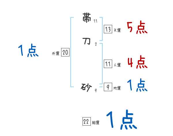 天運![]() | 帯刀砂さんの天運は13画の5つ星!才能に恵まれ人気がある。名声を手に入れる。円満な人生。 家系が持つ宿命的な運勢を表します。祖先から受け継いだ苗字ですので自分の力が及びません。家柄を象徴します。 |