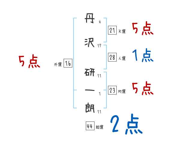 天運![]() | 丹沢研一朗さんの天運は21画の5つ星!統率力がある。独立し成功する。名誉を手に入れる。 家系が持つ宿命的な運勢を表します。祖先から受け継いだ苗字ですので自分の力が及びません。家柄を象徴します。 |