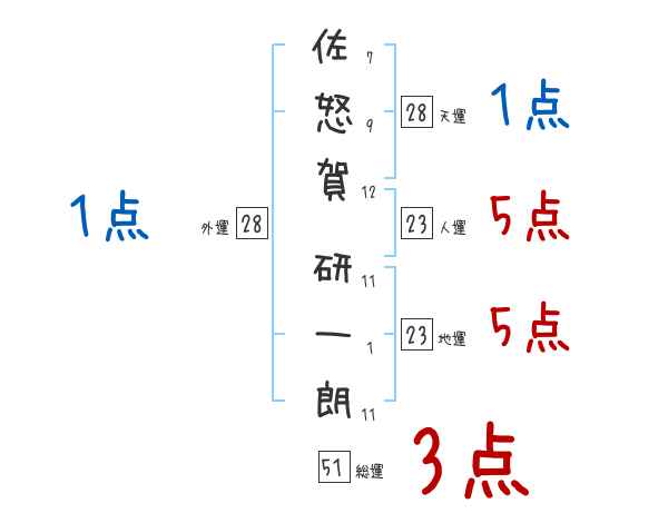 総運![]() | 佐怒賀研一朗さんの総運は51画の3つ星!変化が激しく、危険に注意。堅実な性格。 あなたの人生を表す1番重要な運勢です。生涯を通じて影響する総合運となり、主に50歳以降の晩年期に影響を及ぼします。 |