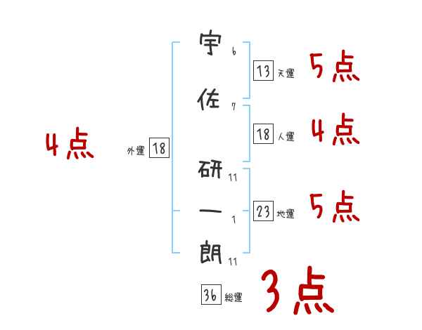 総運![]() | 宇佐研一朗さんの総運は36画の3つ星!先見性が豊かです。多少神経質で苦労することも。 あなたの人生を表す1番重要な運勢です。生涯を通じて影響する総合運となり、主に50歳以降の晩年期に影響を及ぼします。 |