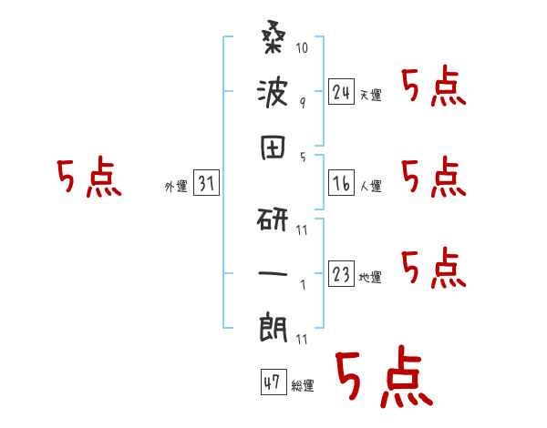 総運![]() | 桑波田研一朗さんの総運は47画の5つ星!実力が開花し発展する円満な人生。財に恵まれる。 あなたの人生を表す1番重要な運勢です。生涯を通じて影響する総合運となり、主に50歳以降の晩年期に影響を及ぼします。 |