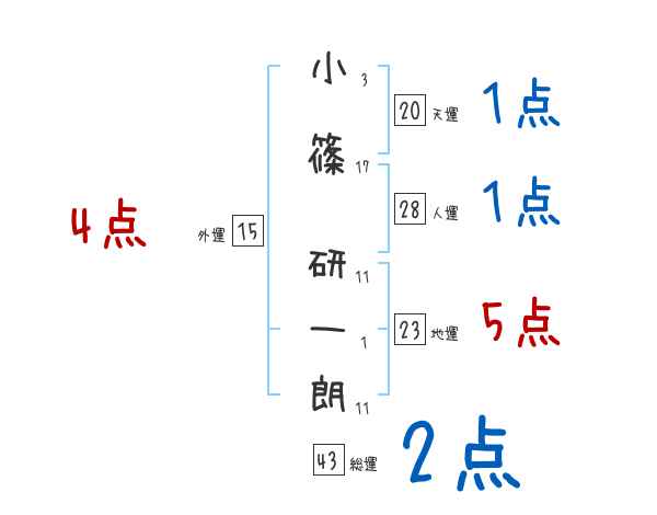 総運![]() | 小篠研一朗さんの総運は43画の2つ星!頑固な性格で独立心が強いかも。やや非現実的で浪費に注意しましょう。 あなたの人生を表す1番重要な運勢です。生涯を通じて影響する総合運となり、主に50歳以降の晩年期に影響を及ぼします。 |