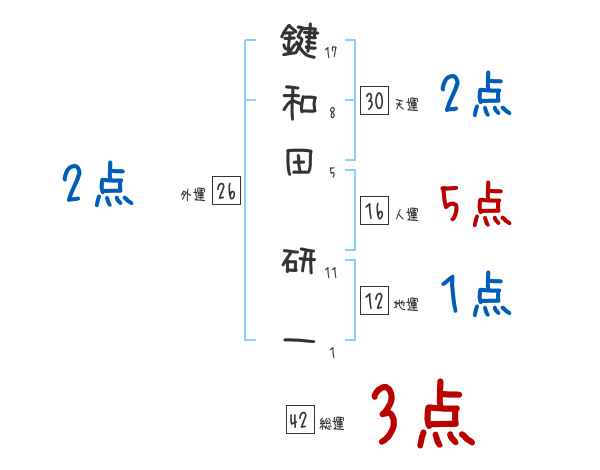 人運![]() | 鍵和田研一さんの人運は16画の5つ星!人望が厚く大きく発展する。逆転成功が見える。 性格や才能などを表す2番目に重要な運勢です。人間関係や協調性、社会的な成功に影響します。主に20歳から50歳ぐらいまでの中年期の運勢を表します。 |
