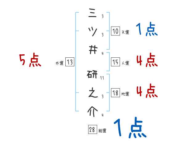 総運![]() | 三ツ井研之介さんの総運は28画の1つ星!家庭環境に注意。スポーツで活躍できる能力があるかも。 あなたの人生を表す1番重要な運勢です。生涯を通じて影響する総合運となり、主に50歳以降の晩年期に影響を及ぼします。 |