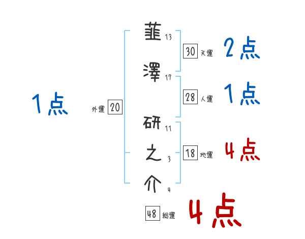天運![]() | 韮澤研之介さんの天運は30画の2つ星!浮き沈みの激しさに注意しましょう。 家系が持つ宿命的な運勢を表します。祖先から受け継いだ苗字ですので自分の力が及びません。家柄を象徴します。 |