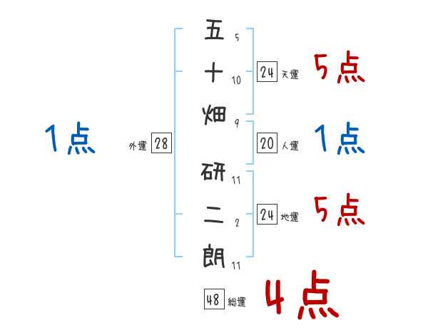天運![]() | 五十畑研二朗さんの天運は24画の5つ星!家庭運が良く順調な人生。金運にも恵まれる。 家系が持つ宿命的な運勢を表します。祖先から受け継いだ苗字ですので自分の力が及びません。家柄を象徴します。 |