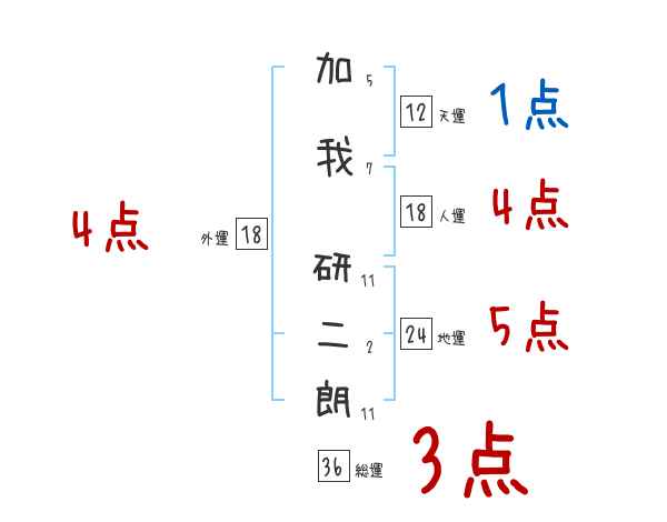天運![]() | 加我研二朗さんの天運は12画の1つ星!簡単な失敗で諦めてしまいやすいかも。着実に行動すると良いでしょう。 家系が持つ宿命的な運勢を表します。祖先から受け継いだ苗字ですので自分の力が及びません。家柄を象徴します。 |