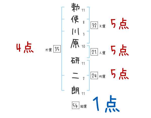 天運![]() | 勅使川原研二朗さんの天運は32画の5つ星!柔軟性があり成功する。チャンスが多く金運が良い。 家系が持つ宿命的な運勢を表します。祖先から受け継いだ苗字ですので自分の力が及びません。家柄を象徴します。 |