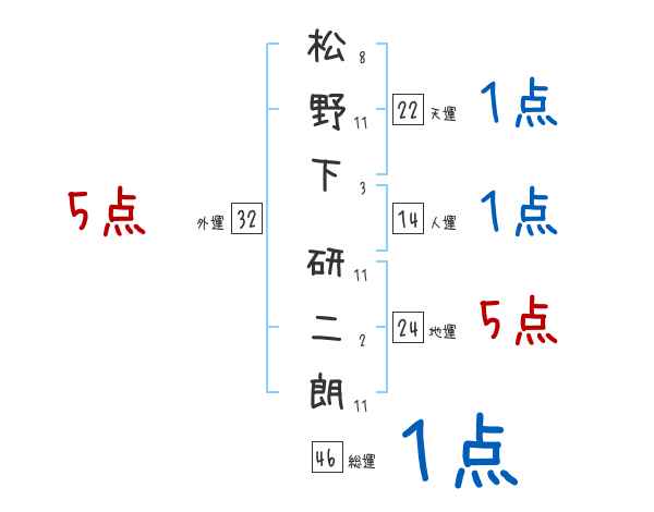 外運![]() | 松野下研二朗さんの外運は32画の5つ星!柔軟性があり成功する。チャンスが多く金運が良い。 生活面を象徴する運勢です。外部から受ける影響力を表し、結婚運、家庭運や職場、環境への順応性を表します。 |