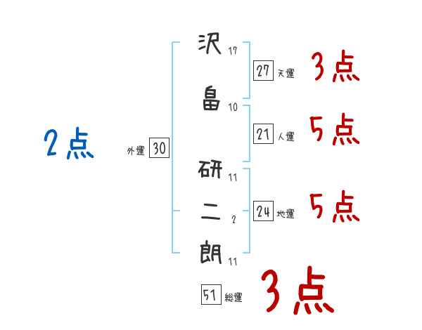 天運![]() | 沢畠研二朗さんの天運は27画の3つ星!頭脳明晰だが強情で摩擦が多い傾向。孤立に注意。 家系が持つ宿命的な運勢を表します。祖先から受け継いだ苗字ですので自分の力が及びません。家柄を象徴します。 |