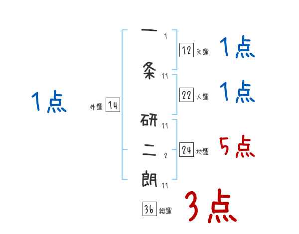 人運![]() | 一条研二朗さんの人運は22画の1つ星!努力することが苦手ないっぽう手先が器用。芸術性にも優れる。 性格や才能などを表す2番目に重要な運勢です。人間関係や協調性、社会的な成功に影響します。主に20歳から50歳ぐらいまでの中年期の運勢を表します。 |