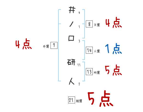 外運![]() | 井ノ口研人さんの外運は7画の4つ星!強い意志や信念を持ち独立心が強い。自立する。 生活面を象徴する運勢です。外部から受ける影響力を表し、結婚運、家庭運や職場、環境への順応性を表します。 |