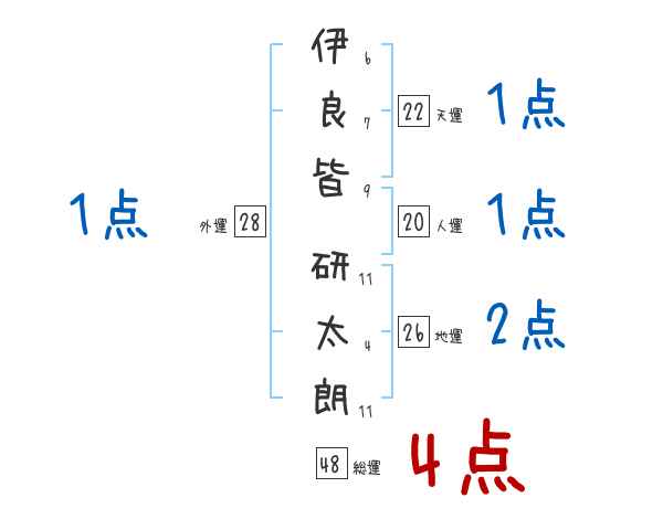 外運![]() | 伊良皆研太朗さんの外運は28画の1つ星!家庭環境に注意。スポーツで活躍できる能力があるかも。 生活面を象徴する運勢です。外部から受ける影響力を表し、結婚運、家庭運や職場、環境への順応性を表します。 |