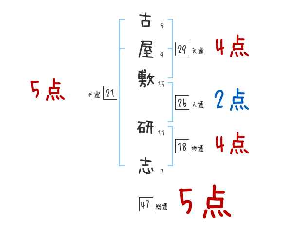 総運![]() | 古屋敷研志さんの総運は47画の5つ星!実力が開花し発展する円満な人生。財に恵まれる。 あなたの人生を表す1番重要な運勢です。生涯を通じて影響する総合運となり、主に50歳以降の晩年期に影響を及ぼします。 |